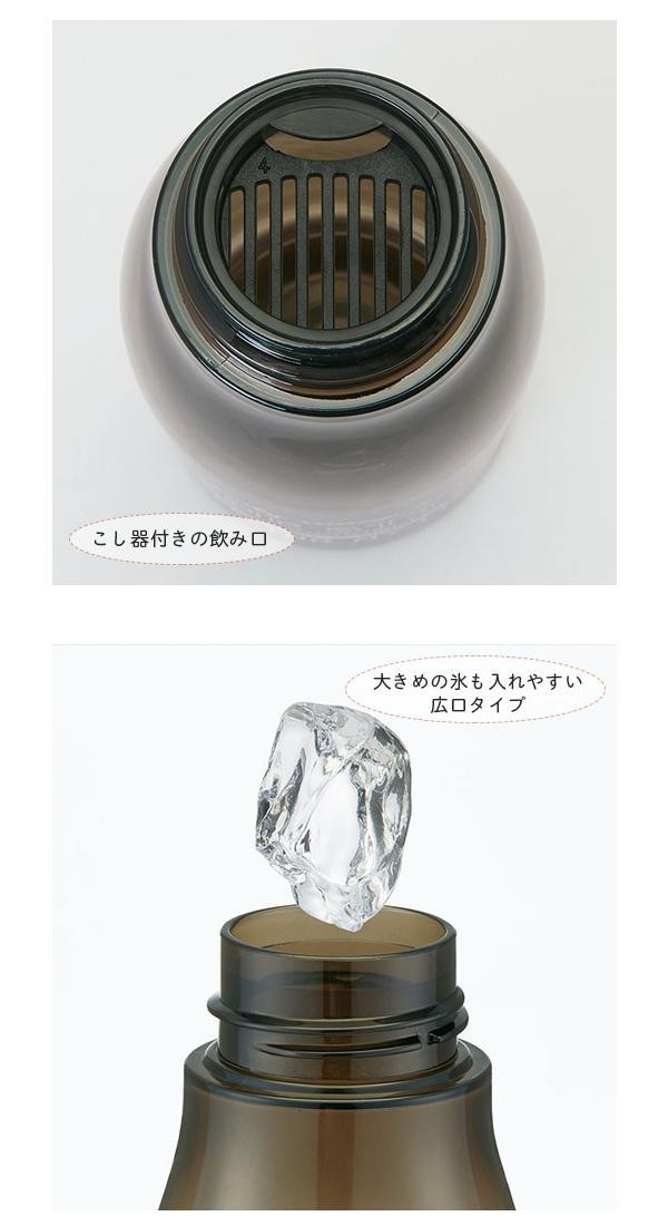 | フタを開けてすぐ飲める直飲みタイプ。ネジ式のフタなので水もれしにくく、持ちやすい形状です。液体だけが飲めるこし器付き飲み口なので、フレーバーウォーターなどにもピッタリ!! |