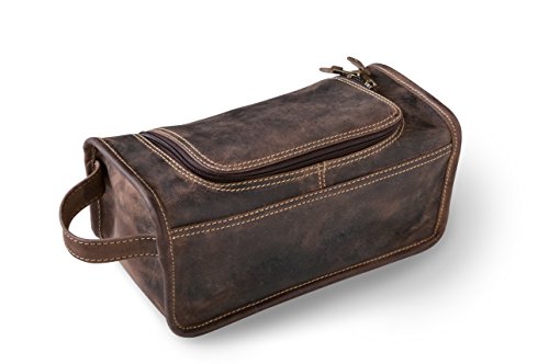 Product Description Pleasing your guy with our handsome Personalized Distressed Brown Borello Travel Dopp Kit will be easy due to the stylish and rugged craftsmanship of the distressed full-grain buffalo hide and functional, no-frills design. Plunging his hands inside to retrieve his dependable personal care items will be no problem with the travel gear's wide u-shaped opening, served by dual zippers. When considering gifts for him, this durable dopp kit can take any punishment he can dish out on the road, and the leather grab handle makes it easy to carry around or hang on a shower hook when he's ready to freshen up. His personal effects are pampered inside with a high-quality, tear-resistant polydrill lining. 0
