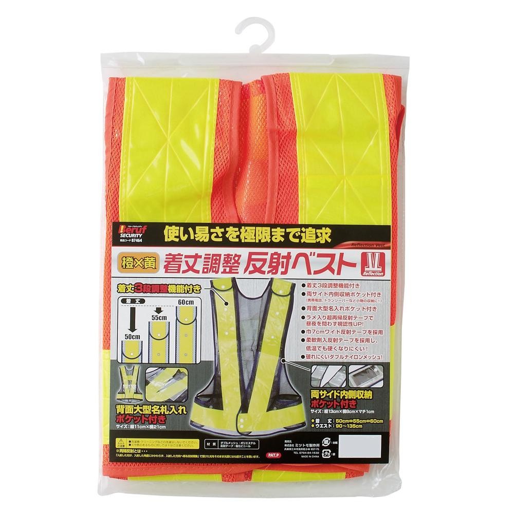 | 着丈を50cm・55cm・60cmの3段階に調整可能!!破れにくいダブルナイロンメッシュのベストです。両サイド内側にはスマホなどを入れられる収納ポケット、背面には大型の名札入れ付き。ラメ入りの再帰反射テープは幅7cmのワイドタイプで昼夜問わず視認性も◎!!柔軟剤入りテープなので、低温でも硬くなりにくい仕様です。 |