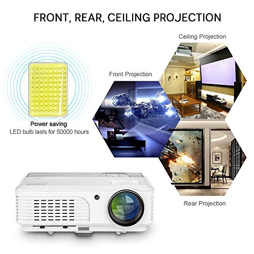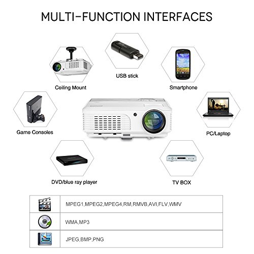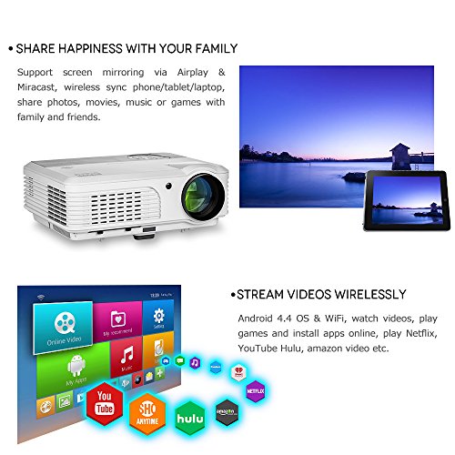 Home entertainment projector with Android4.4.4 OS: 1GB RAM/ 8GB ROM, built in Google Play Store, YouTube, Netflix, Kodi, Facebook and other apps, ready to wireless stream movies, video games, music, slide shows from your Apple or Android device over Wi-Fi