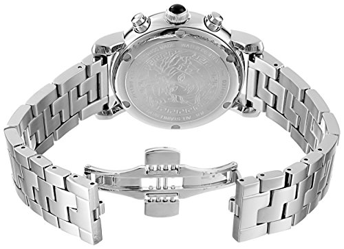-. Feature : Stainless steel watch featuring black mother-of-pearl dial with Medusa, skeleton hands, and three chronograph subdials / 38 mm stainless steel case with antireflective sapphire dial window / Swiss quartz movement with analog display / Greca pattern-inspired stainless steel link bracelet featuring deployant clasp with push-button closure / Features date window, tachymeter, serial number on case back, and cabochon-capped crown / Water resistant to 50 m (165 ft)