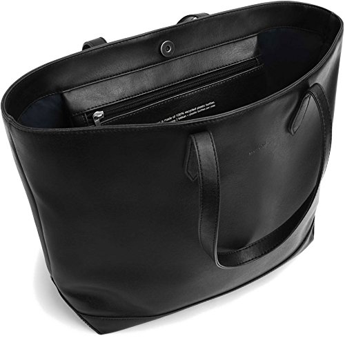 Tote with magnetic snap closure. INTERIOR: logo-embossed hanging pouch pocket. 100% recycled nylon lining.
