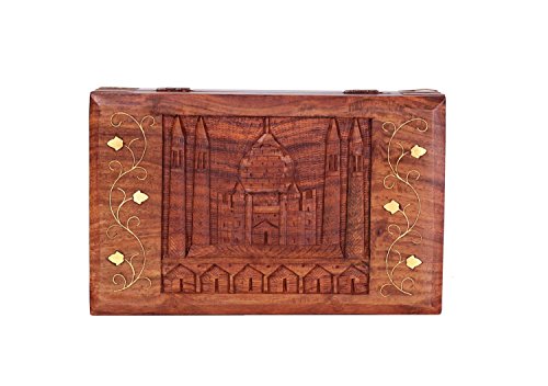 - Feature : Dimensions: Length - 8 inches x Width - 5 inches x Height - 2 inches. / Exquisite box is made using one of the richly hued timber Indian Rosewood and further adorned with hand carvings of the wonder Taj Mahal motif. / The beauty, rawness and character of timber will guarantee this piece to be a unique addition to any decor with its country rustic feel / Store your jewelry, trinkets, treasures, collectibles, tarot cards, Fend shui items, incense, herbs, tools and whatever makes you happy / Dated back to 400 years ago in the Mughal period, artisans of Saharanpur started wooden carving work and now 1,00,000 artisans are involved in this industry making world's finest handicrafts