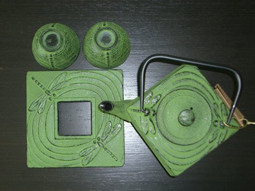-. Title : Happy Sales HSCT-SDY19, Cast Iron Tea Pot Tea Set Square Dragonfly Green