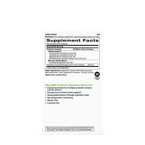 Clinically Studied Multi-Strain Probiotic Customized For Women's Health May Provide Urinary, Digestive & Immune Support Why Gnc Probiotic Solutions Women's? Customized Blend Of Multiple Probiotic Strains Just For Women Cranberry For Urinary Tract Support Guaranteed Potency Through Expiration Date No Refrigeration Necessary Gluten Free Lactose FreeFeature