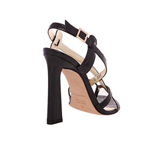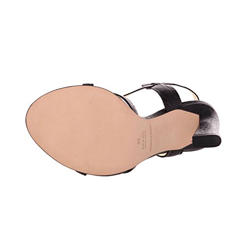 Complete your every day look ensemble with an elegant pair of this black crocodile print leather strappy high heel thong sandals, featuring crossing adjustable straps and a simple high heel for an extra dose of glamour.