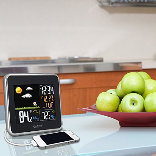Weather in color, right at your fingertips. Vibrant LCD with light dimmer for nighttime use with On-Demand option by battery power or continuous lighting using included AC adapter. Charging USB port for mobile devices (charging cord, not included) Displays indoor & outdoor temperature and humidity, and features atomic self-setting time and date with automatic daylight saving time reset. Includes weather resistant wireless transmitting outdoor sensor with range up to 200 ft.
