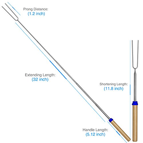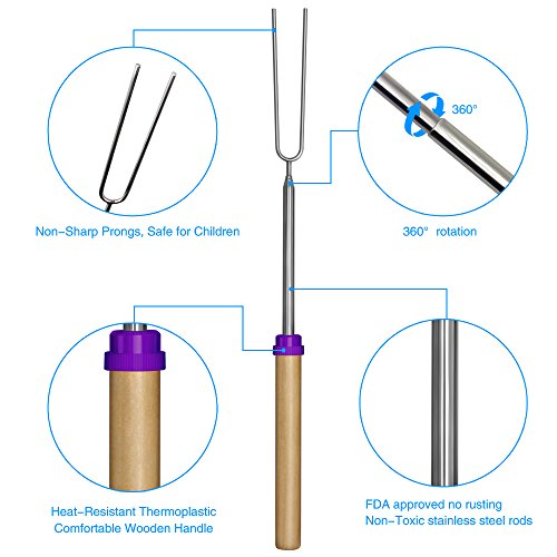 - ✔SAFE FOR CHILDREN: 32'' Extra Long Extendable Telescoping forks keep you and kids at a safe distance from any patio fire pit, backyard fire pit, bonfire pit, or campfire. Non-sharp prongs make them perfect for use around kids. NO MORE FIGHTING: 8 multi colored BPA FREE handle tips make identification easy when kids join in the fun- No more fighting about which stick belongs to who