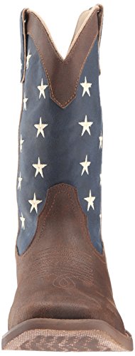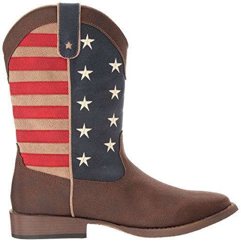 Studio : Roper Publisher : Roper Binding : Apparel Product Description The men’s american patriot western boot by Roper is handcrafted to perfection with the brown vintage faux leather vamp and crown and an american flag shaft. It is a wide square toe boot with a faux leather sole and a padded insole for extra comfort. 0
