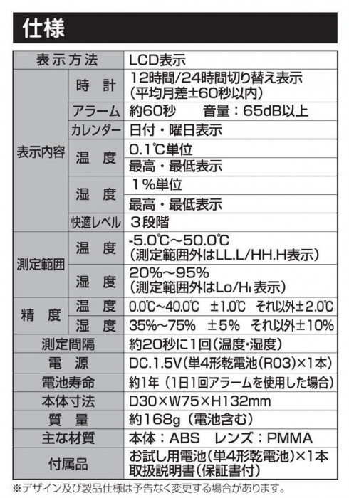 fk094igrjsお部屋に馴染む柔らかな色使いの温湿度計。 製造国:中国 素材・材質:ABS、PMMA 商品サイズ:D30×W75×H132mm 重量:約168g(電池含む) 付属品:単4形アルカリ乾電池(お試し用)×1本取扱説明書(保証書付、保証期間:お買上げ後1年間)※お届け地域により、別途運賃がかかる場合やお届けできない場合がございますので、お問い合わせ下さい。