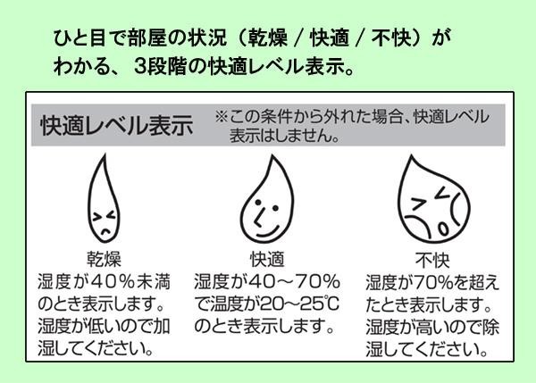●ひと目で部屋の状況(乾燥/快適/不快)がわかる、3段階の快適レベル表示。