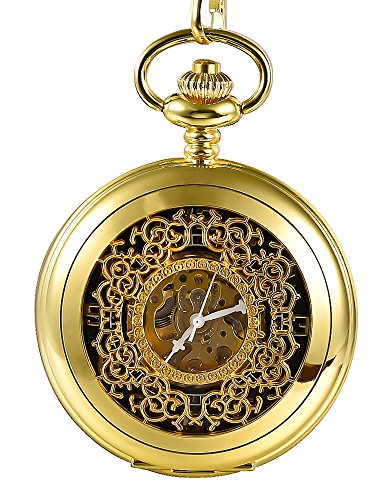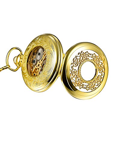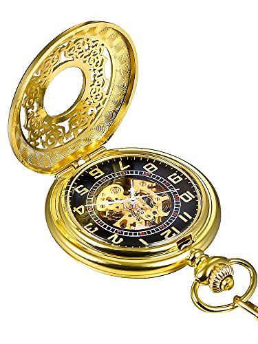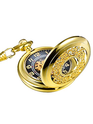 -. Feature : Vintage pocket watch: the retro pocket watch with a gold tone metal chain, black dial with digital numerals scale which brings you back to your memory in youth / Elegant and unique design: skeleton dial shows exquisite movement and structure within the watch; Delicate carving shows your special aesthetics / Excellent good quality: stainless steel appearance has pretty floral carvings provide a large window you can see the gears through; Alloy chain have a good length, allowing secure attachment to jeans or pants / Easy setting time: pull the crown away from base of the watch and turn the crown clockwise until reaching the exact time, it will keeps accurate time / A good present: original pocket watch is the good gift for your lover, seniority, friends or yourself; Beautiful pocket watch, gleaming presentation