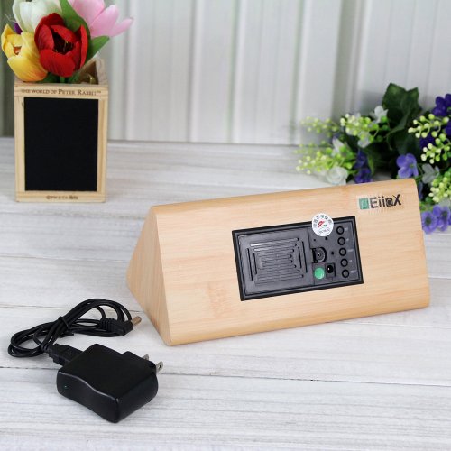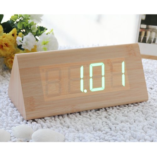EiioX Fashion Triangle Green LED Wooden Imitation Alarm Clock Digital Wood Alarm Clock Desktop- Time Temperature Date - Sound Control - Latest Generation