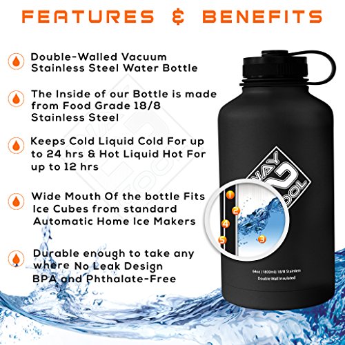 VACUUM INSULATED -Our 64 ounce Way 2 Cool Stainless Steel wide mouth keeps drinks fold for up to 24 hours and hot liquids up to 12 hours.GURANTEED NOT TO SWEAT - Our premium grade material will not "sweat" leaving that annoying ring of liquid on the table's surface.