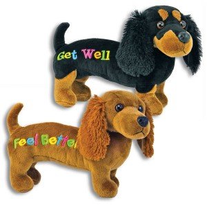 -. Feature : Adorable Get Well Black Dachshund PLUSH DOG - This is the Black Dog in BACKGROUND of picture / Great gift for sick friend or relative / You can have him sent right to the hospital to cheer up someone special. / Black dog with brown feet and trim, Get Well embroidered on side in bright cheerful colors / Awesome Get well gift