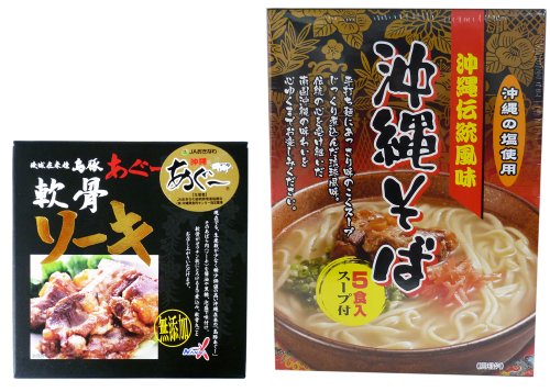 -. Feature : 内容量:【軟骨ソーキ】180g【沖縄そば(5食入り)】450g(めん80g×5、スープ10g×5) / カロリー:【沖縄そば(5食入り)】(1食(麺80g、スープ10g)あたり)304kcal / 商品サイズ(高さx奥行x幅):235mmx80mmx170mm / 原材料:【軟骨ソーキ】あぐー豚軟骨肉(沖縄)、しょうゆ、砂糖、本みりん、カツオエキス、黒糖、泡盛(原材料の一部に遺伝子組み換えでない大豆、小麦を含む)【沖縄そば(5食入り)】(めん)小麦粉、食塩、かんすい、着色料(くちなし黄色素) (添付調味料)食塩、かつおぶし、粉末しょうゆ、ポークエキス、でんぷん分解物、粉末油脂、砂糖、煮干エキス、たまねぎ、なたね油、調味料(アミノ酸等)、カラメル色素 ※原材料の一部に小麦、乳成分、大豆を含む