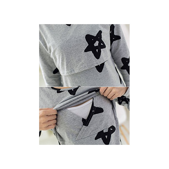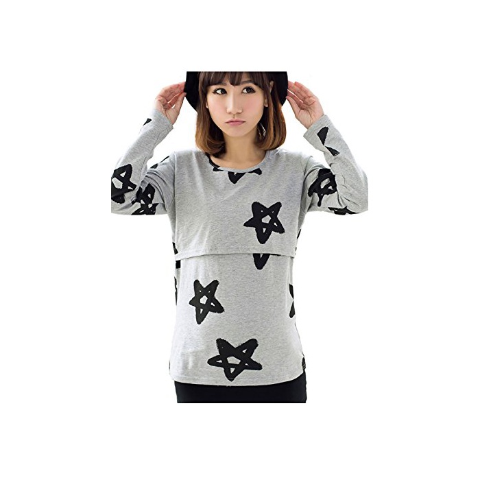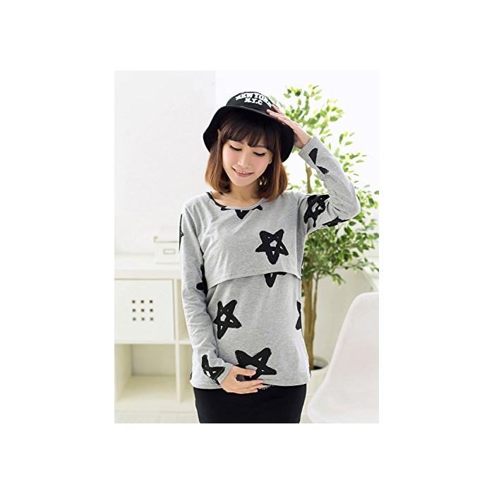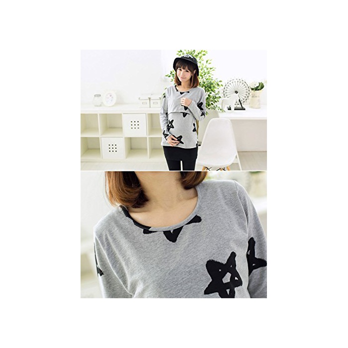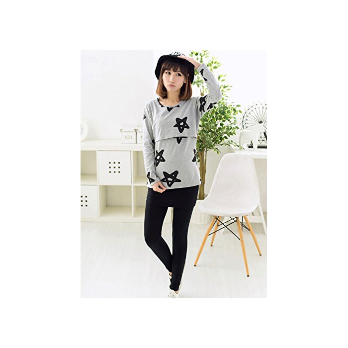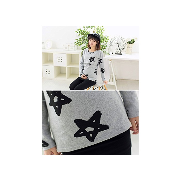 【MIKA&MAYA】 마타니티 T셔츠 긴 소매 수유 톱스 튜닉 실내복 레이디스 별 (M 사이즈,그레이)