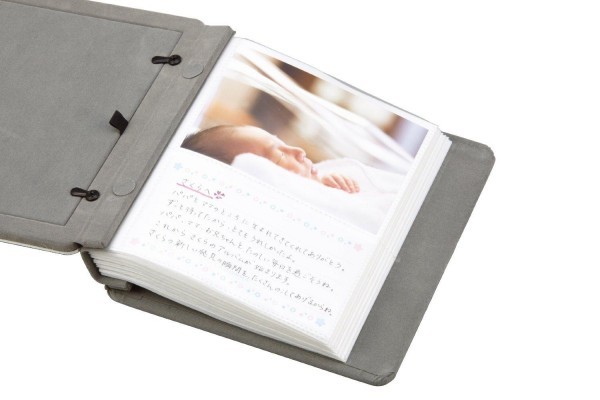| 写真1点ずつに、パパやママの思いが書き込めるメモ用紙付き。赤ちゃんの「はじめて」のアルバムに。 |
