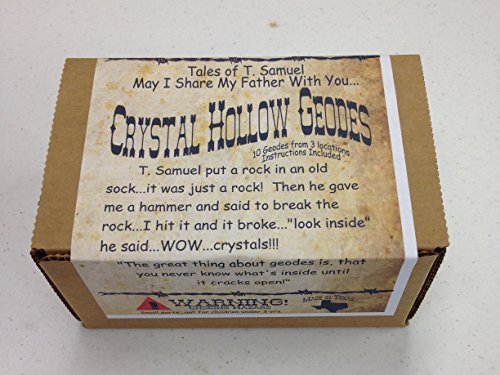 -. Binding : Toy -. Brand : T. Samuel -. EAN : 0700113100894 -. Feature : 10 Geodes from 2 Different Places! / Instructions Included / Hollow Geodes, not Solid, Crystals Inside! / 1 1/2 - 2 1/4 Inches! / Geology is Fun! Educator Approved! -. IsAdultProduct : 0 -. Label : T Samuel -. Manufacturer : T Samuel -. MPN : 7070 -. PackageQuantity : 10 -. PartNumber : 7070 -. ProductGroup : Toy -. ProductTypeName : TOYS_AND_GAMES -. Publisher : T Samuel -. Studio : T Samuel -. Title : Crack Your Own Crystal Hollow Geodes - 10 Pack -. UPC : 700113100894