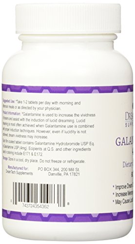 -. Binding : Health and Beauty -. Brand : Double Wood Supplements -. EAN : 0743724354362 -. Feature : IMPROVE MEMORY AND RECALL - Increases overall levels of acetylcholine in the brain / INCREASE DREAM INTENSITY - Galantamine increases the vividness and intensity of dreams / INDUCE LUCID DREAMS - Galantamine supplementation is commonly used to improve the liklihood of lucid dreaming. / NATURALLY OCCURRING - Galantamine is a naturally occuring plant extract, taken from the Shorttube Lycoris Lily plant / 100% MONEY BACK GUARANTEE - We don't want anyone to feel ripped off and provide a no questions asked money back guarantee -. IsAdultProduct : 0 -. Label : Double Wood LLC -. LegalDisclaimer : Always consult with your physician before taking Galantamine. Do not combine Galantamine with alcohol. Discontinue use and consult your doctor if any adverse reactions occur. Keep out of reach of children.No statements made on this site have been evaluated by the Food and Drug Administration. This product is not intended to diagnose, treat, cure, or prevent any disease. -. Manufacturer : Double Wood LLC -. MPN : BW -. PartNumber : BW -. ProductGroup : Health and Beauty -. ProductTypeName : HEALTH_PERSONAL_CARE -. Publisher : Double Wood LLC -. Studio : Double Wood LLC -. Title : Galantamine - Lucid Dreaming & Nootropic Supplement - 4 Mg - 60 Capsules -. UPC : 743724354362