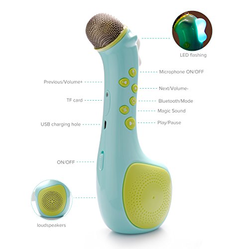THREE WAYS TO PLAY! Magic voice: it can switch 5 different voices to sing. Sling-along: portable karaoke for family; Speaker: it also used as a handheld Bluetooth speaker and support TF card (Not include).