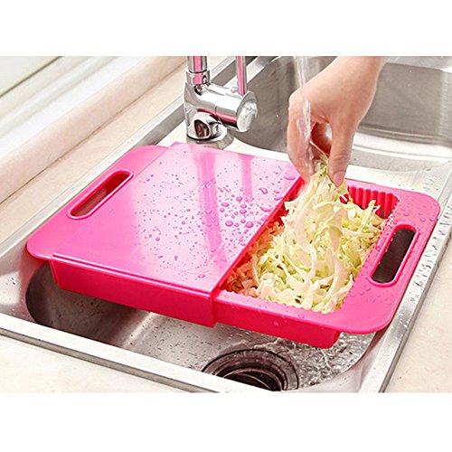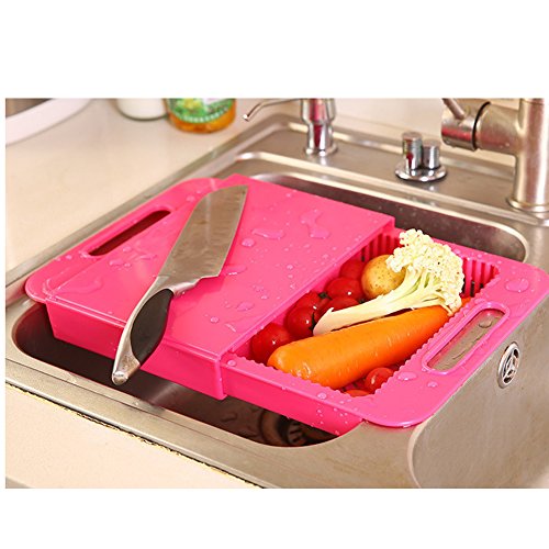 Mr.Dakai Sink Cutting Board with Handle, 3 in 1 Multifunctional Removable Chopping Blocks Filter Frame, Vegetables Drainage With Drain Basket Shelf Kitchen Tools (Pink)