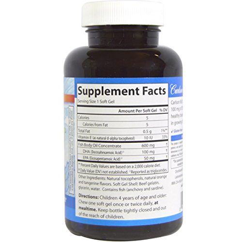 Studio : Carlson Labs Publisher : Carlson Labs Binding : Health and Beauty Product Description Freshness Potency - Purity Guaranteed Omega-3s Dietary Supplement Promotes Heart, Brain, Vision and Joint Health Specializing in the Finest Norwegian Fish Oils Since 1982 Gluten-Free Sugar-Free Preservative-Free Purity Guaranteed Carlson Kid's Chewable DHA provides 100 mg of DHA, which is vital for healthy brain development and vision in growing children. 0