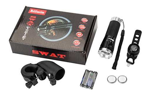 What is Included in the Box? FRONT LIGHT: ?Long lasting fully adjustable cree, led, high quality light ?Waterproof! ?Handlebar clamping system - No tools required ?3 Light Settings -bright,medium,flash ?3 AAA batteries included