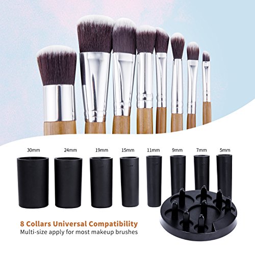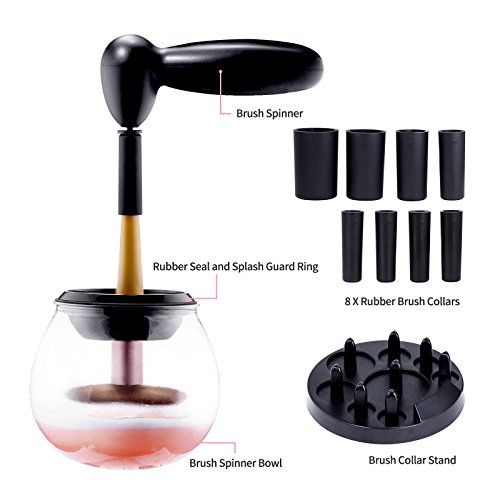 - EASY TO USE: 1. Put water and brush cleaning solution into the plastic bowl; 2.Attach the brush to the spinner, dip & dunk the brush in cleaning solution; 3. Spin the brush to clean it; 4. Re-rinse in clean water, Spin to dry it. 8 different sizes collars fit for various size makeup brushes.