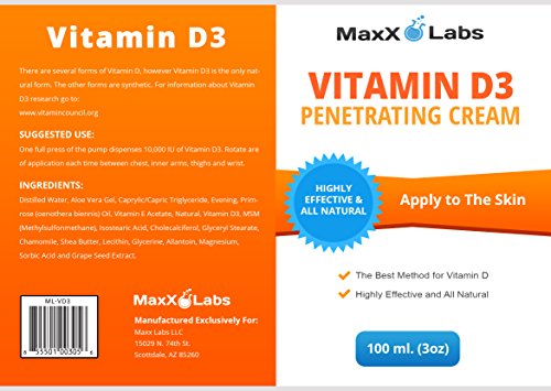 MaxX Lab's Vitamin D3 Cream has been formulated to outperform all others on the market and delivers 10,000 (I.U.) with every full stroke of the pump!