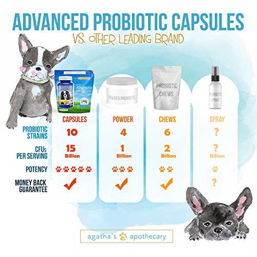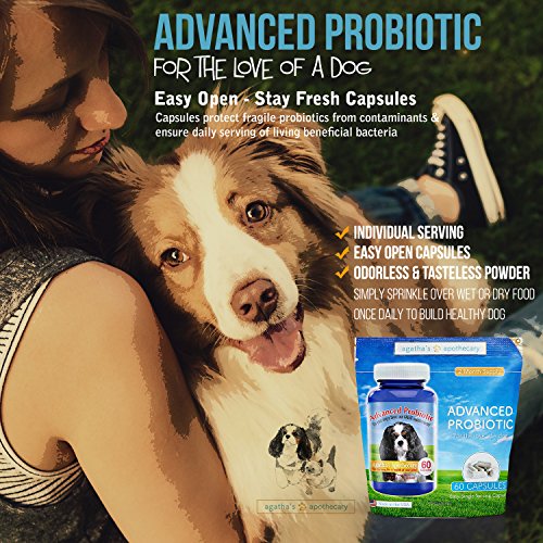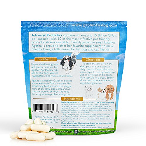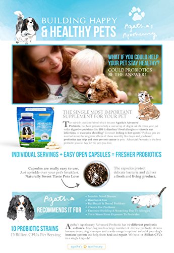 Is YOUR Dog Good Bacteria & Mineral Deficient?More and more dogs are showing signs of digestion issues, mineral & vitamin deficiencies because over-farming of the soil has drained essential nutritional elements.Deficiencies are linked to a major rise of Cushing's disease in dogs. Fortunately, a premium multi strain probiotic and prebiotic like Agatha's Advanced Probiotic is rich in organic coral calcium with 74 trace minerals that are missing from commercial dog foods.But Not All Probiotics Are Created EqualWith all the hype and dog probiotic products crowding the market, a lot of companies are trying to cash in by releasing low grade dog probiotics that don't contain enough strains or CFUs to even make a difference!That's Why You Need A Proven Probiotic With The Right DosageSpend the extra effort to make sure that your dog is getting the very best.Agatha's Apothecary Advanced Probiotic has 10 Diverse Probiotic Cultures. Your dog needs a large number of different probiotic strains because every dog is unique and a wide range of probiotic strains is optimal to build your dog's immune system and help them heal and repair and We Have 15 Billion CFUs in a Capsule!Most other pet probiotics claim to be highly potent - but in reality only contain a minimal number of vital probiotic CFUs (colony forming units).Agatha's Apothecary Advanced Probiotic on the other hand contains 15 Billion Probiotic CFU's per capsule. Simply put, our probiotic has more CFU's in ONE CAPSULE than most others put in their entire packages!Total Health GuaranteeAs animal lovers, we take our commitment to their health and well being seriously! That's why we stand behind all of our products with a 100% money back, no questions asked guarantee.So with nothing to lose, click add to cart now to try a higher quality probiotic!Feature