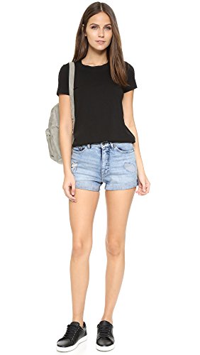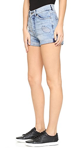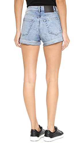 Stone-wash Cheap Monday denim shorts with patched holes. Cuffed hem. 5-pocket styling. Single-button closure and zip fly.