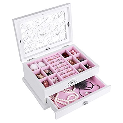 -. Feature : CATCH YOUR EYES: Delicate flower carvings make the jewelry box stand out easily wherever you place it; shinning crystal knob helps attract others' attention / DESIGN AS YOU LIKE: White surface enables you to decorate the exterior freely with innovative paintings, decoupages or stickers / GET ORGANIZED: Keep your jewelries like earrings, rings, bracelets and necklaces in order with 12 compartments, 8 ring rolls and 1 drawer / PROTECT YOUR JEWELRY: Specially designed glass lid keeps your valuables from dust; soft plush lining protect your jewelry from scratches / GREAT GIFT IDEA: Exquisite craftsmanship and superior design make the jewelry organizer a great gift for girls on birthday, Valentine's Day and Christmas