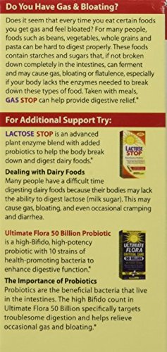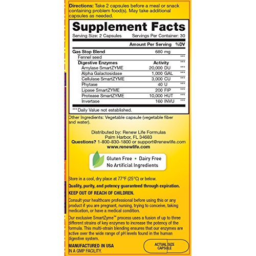 Studio : Renew Life Publisher : Renew Life Binding : Health and Beauty Product Description Fast-acting Gas Stop is specially formulated with digestive enzymes and fennel to help digest beans and other gas-forming foods, and help prevent occasional gas and bloating. Fennel seed helps soothe and relax the digestive tract, so you can feel better again. Gas Stop is made with an advanced blending process called SmartZyme to ensure that the enzymes are active over the broad range of pH levels found in your digestive system. These statements have not been evaluated by the Food and Drug Administration. This product is not intended to diagnose, treat, cure, or prevent any disease. 0