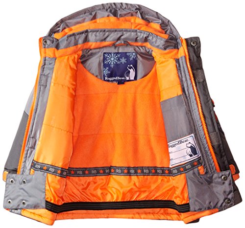 Color-blocked cold-weather jacket featuring polar fleece lining, snap-close storm gator closure at inside waist, and hood with hook-and-loop face shield