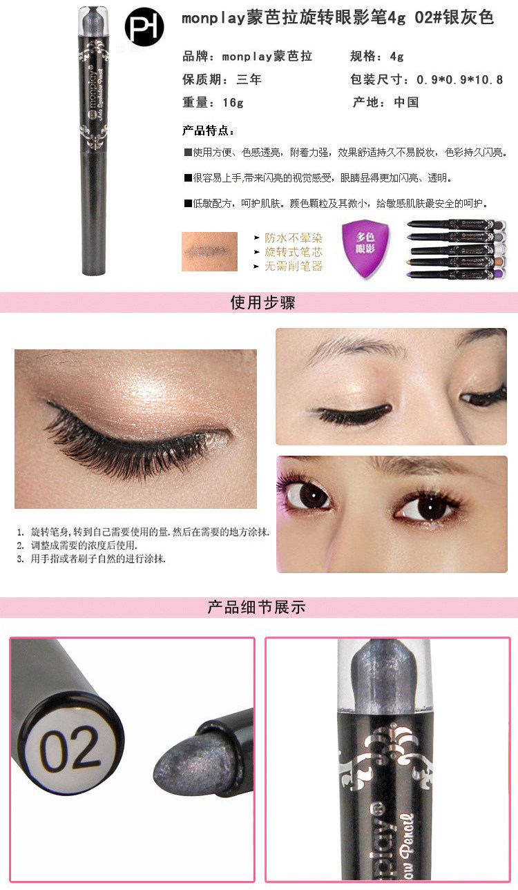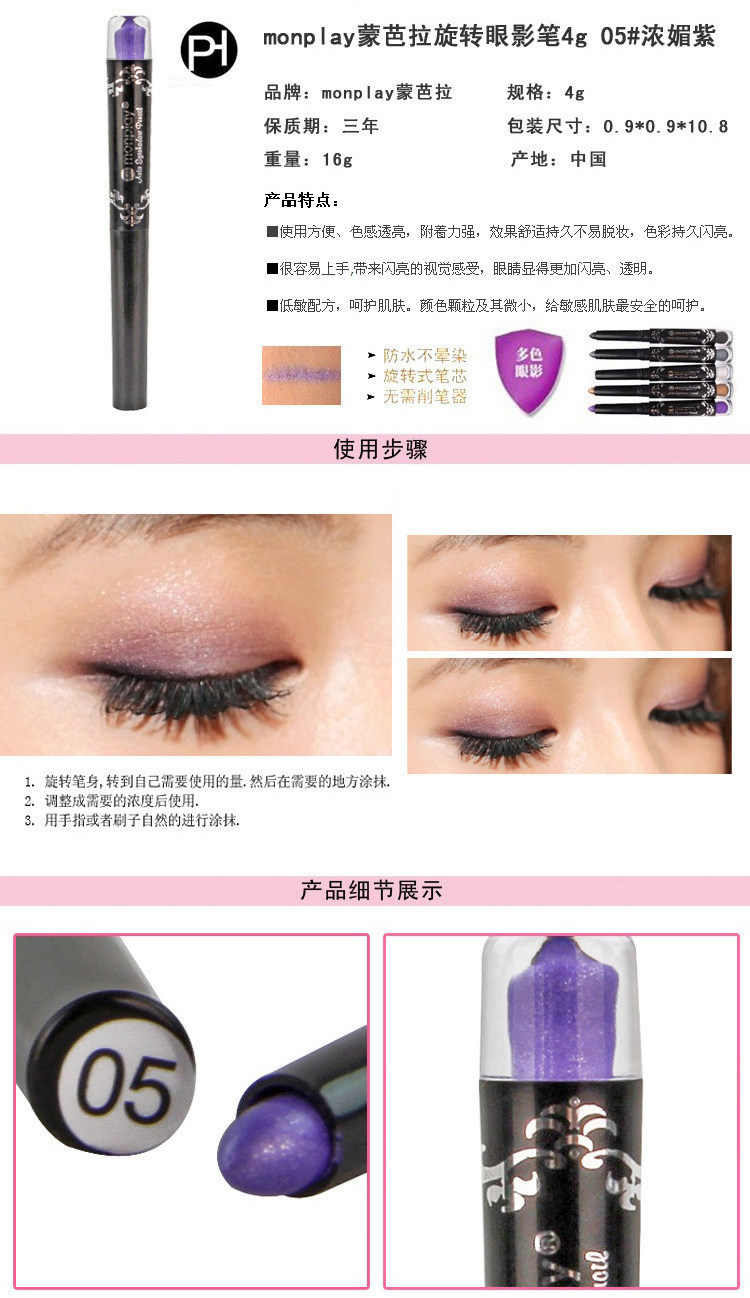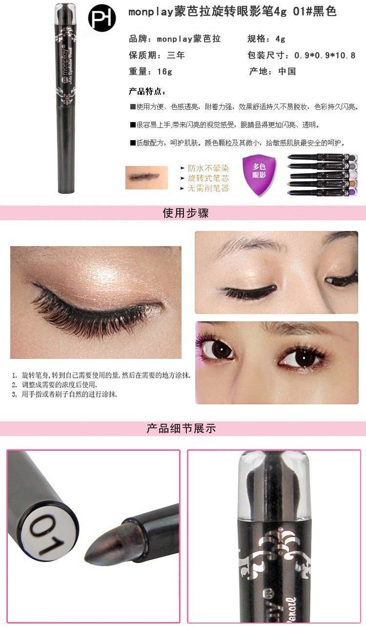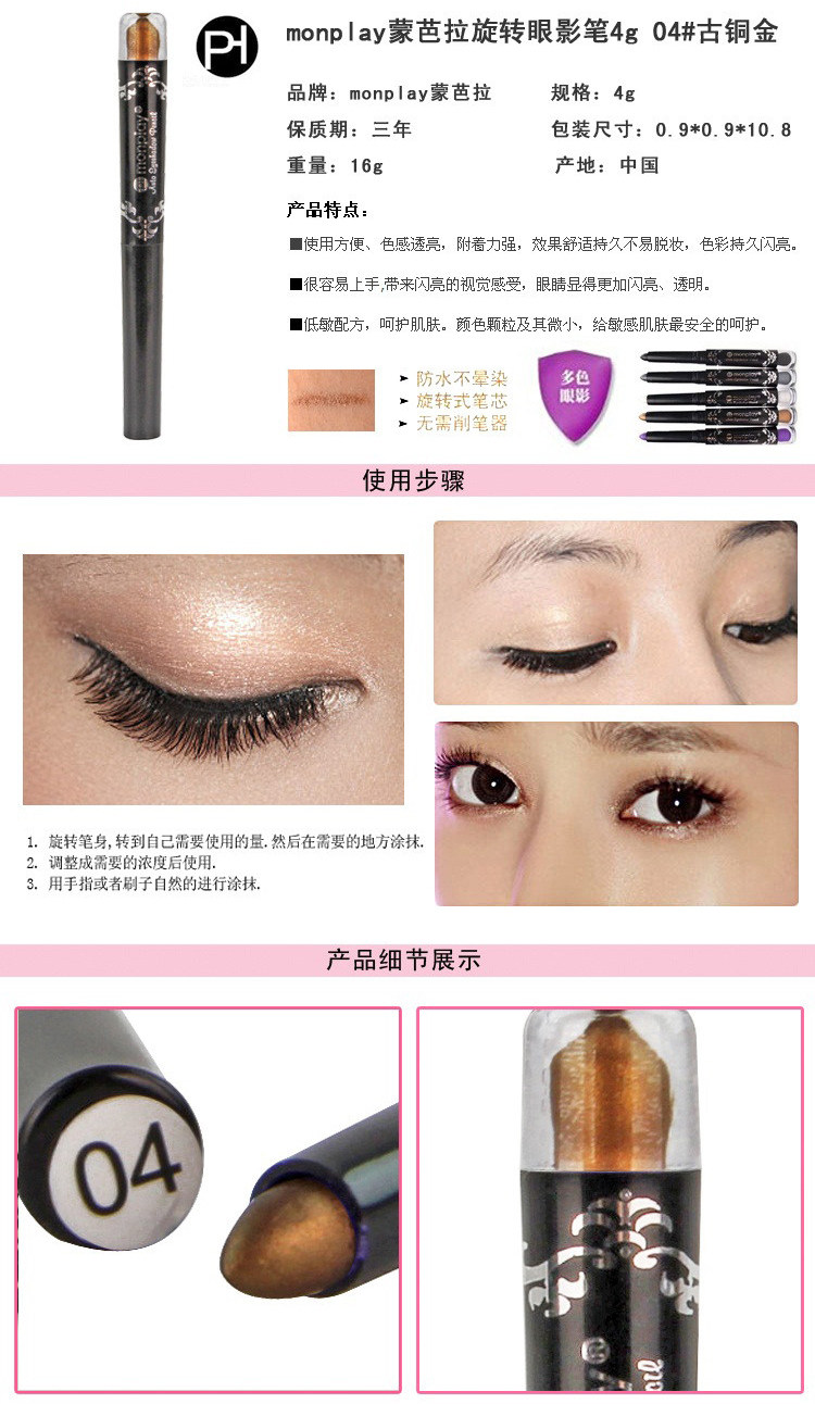 Contain pearl additives, brilliant color, natural, easy on the makeup, delicateuniformly Futie to eye skin. Waterproof anti sweat, easy opening and lasting. Rotary core, without pencil sharpener, convenient to carry, be an easy job to complete the eye makeup, bring you lasting flashing bright light.At the same time, strengthen the eyes curved lines, improve eye brightness,showing the three-dimensional visual effect of eye.