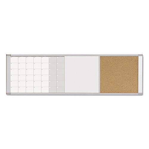 -. Feature : Dimensions: 48W x 0.75D x 18H in. / Magnetic, lacquered steel white board; Aluminum frame / Contains a cork bulletin board / Features a monthly calendar display / Cork board never shows pin holes