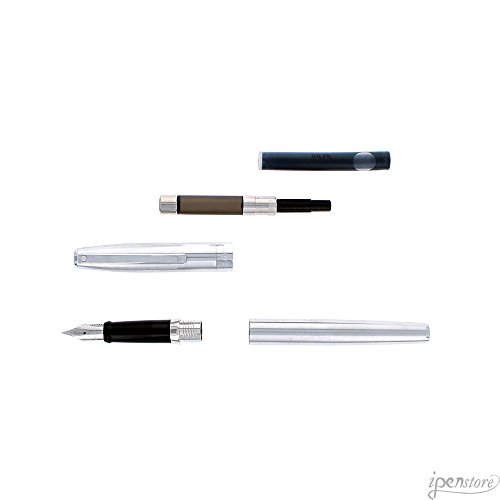 -. Feature : Brushed Chrome featuring Chrome Plate Trim / Fountain pen features a Stainless Steel Nib / Features a glossy resin gripping section for comfort and control / Includes Sheaffer Skrip ink cartridges one blue and one black plus a piston convertor / Packaged in a luxury gift box