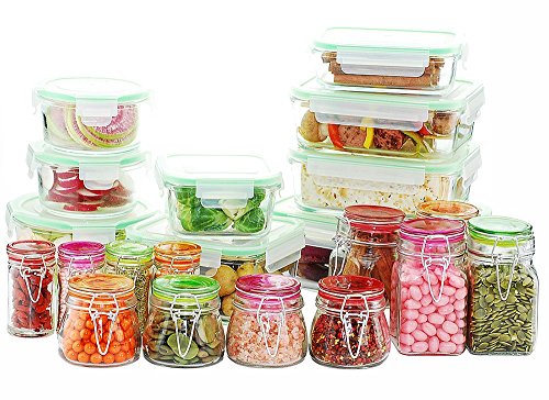 Kinetic 11416 Go Green Glassworks Series 30 Piece Set Glass Food Storage Container with Lid and Mini Jar, Clear