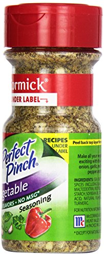 -.McCormick Perfect Pinch Vegetable Seasoning turns salads, sprouts and other greens into the star of the meal. This unique blend of onion, garlic, red bell pepper and other spices turns vegetables into a meal or side dish the whole family will love. And it's made with all natural spices, and no MSG or artificial flavoring -- so you can serve your favorites with a healthy, generous helping of flavor with just a pinch.