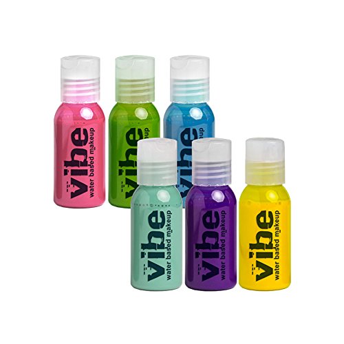 EBA VIBE GLAMOUR 6-PACK Vibe Standard colors consist of primary and secondary colors including UV responsive, metallic and glamour colors.?The Vibe water based airbrush makeup is the cornerstone for face, body art and body painting applications. It is highly pigmented, smudge and transfer resistant, moisture resistant, instantly dry and it can be washed off with soap and water. Vibe is completely water based without any alcohol making it a superb alternative over common hybrid makeups containing solvents. Most importantly as low as 7psi is needed for application making Vibe the most "application friendly" and demanded airbrush water based makeup available on the market. VIBE STANDARD APPLICATION: - Face Art