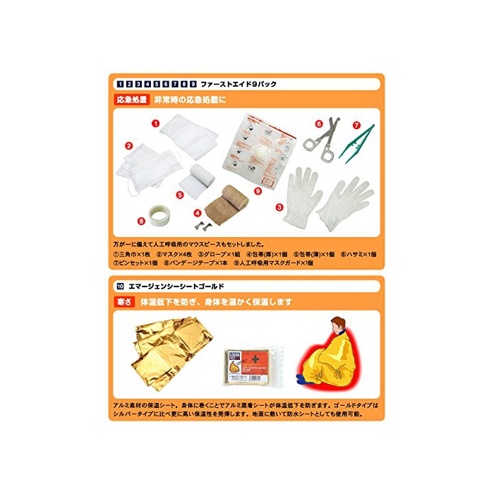 [구성]1.삼각건×1매 2.마스크×4매 3.글로브×1조 4.붕대(후)×1개 5.붕대(얇다)×1개 6.가위×1개 7.핀셋×1개 8.붕대 테이프×1개 9.인공호흡용 마스크 가이드×1개 10.emergency(응급) 씨트 골드