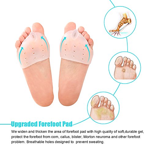 - This set is included 1 pair of gel toe sleeve and 1 pair of toe separator. The toe sleeve is upgraded with wider and thicker forefoot cushion, greatly reduce the fatigue at the bottom of the forefoot, protect the forefoot from corn, callus, blister, Morton neuroma and other forefoot problem. The hole between big and second toe design for different hallux valgus symptoms, it can be stuffed cotton or sponge if you need more spacers for toes. The air hole is designed to making your feet breathe freely, prevent sweating, promote blood circulation. The toe separator is designed to wear at home to separate and straighten 5 toes with more stronger pressure. It can be worn with the gel toe sleeve.When wearing the toe sleeve and toe separator together, they can not only relieve the pain of bunion, but also protect forefoot from corn, callus, blister and Morton neuroma. Directions: