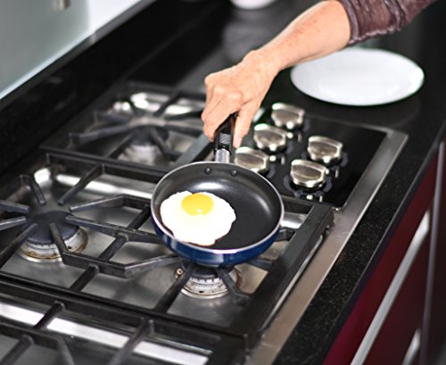 Aluminum skillet distributes heat evenly throughout.