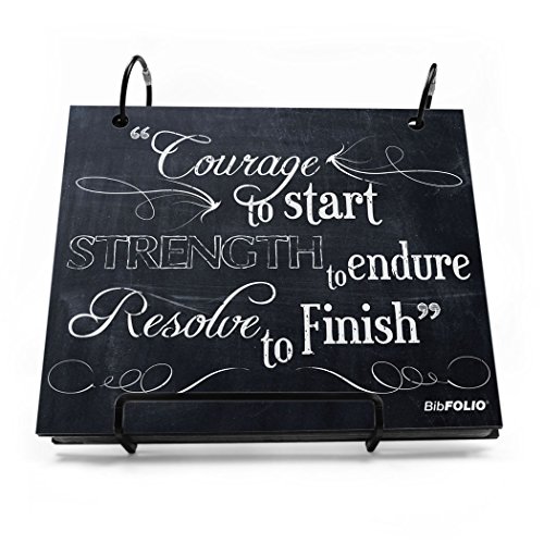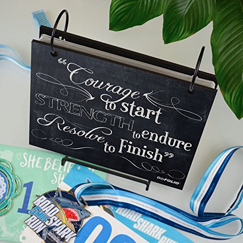 THE ORIGINAL BIBFOLIO® RACE BIB ALBUM protects and beautifully displays your impressive collection of race bibs from marathons, half-marathons, 5Ks, triathlons, road races, and other athletic events. This popular Chalkboard Courage To Start BibFOLIO makes the perfect gift for a runner to keep on display at home or in the office!