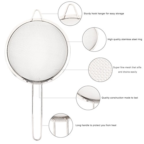 - Long handles on these worry-free stainless steel fine mesh strainers leave you assured that these strainers are as safe in a dishwasher as they are over a burning stove.