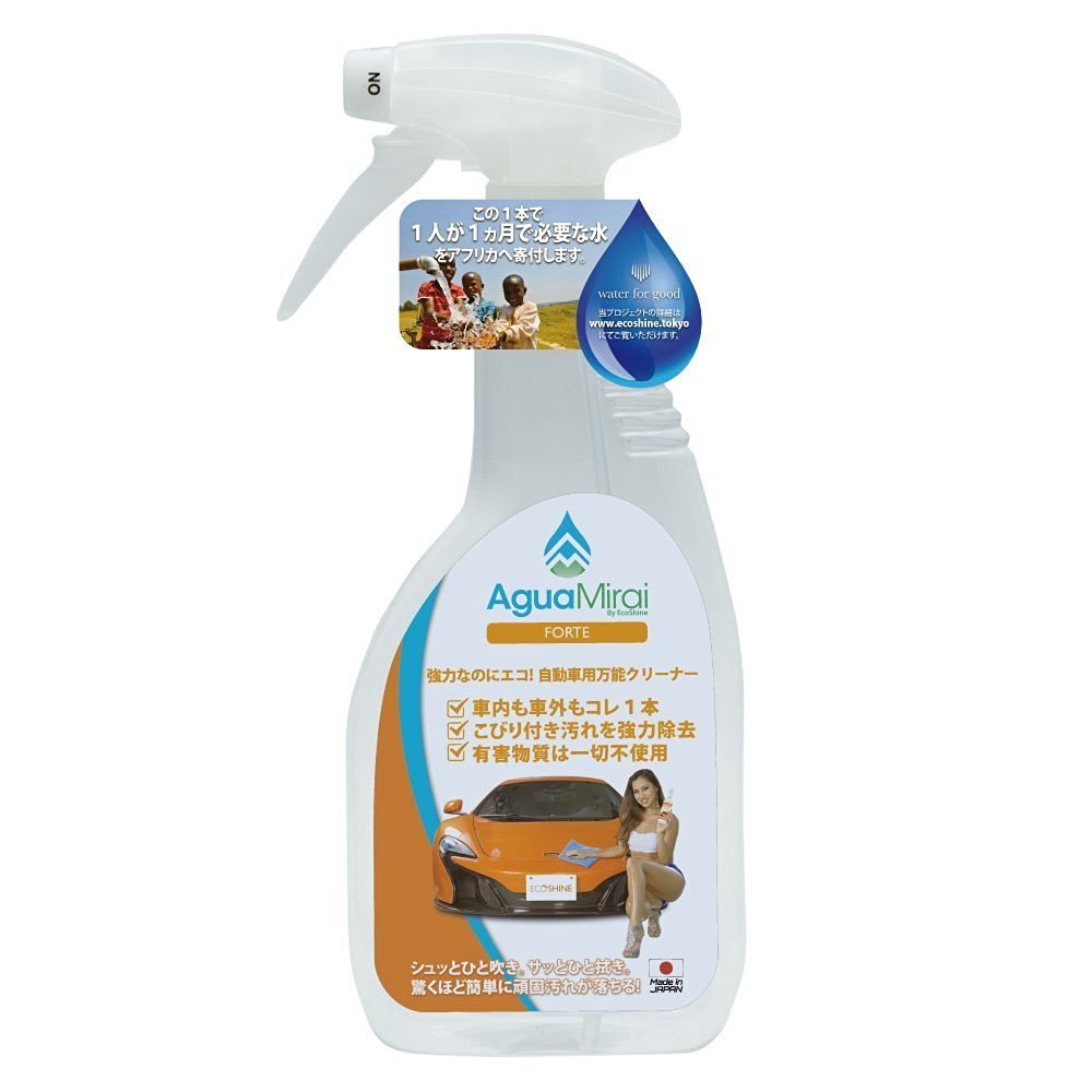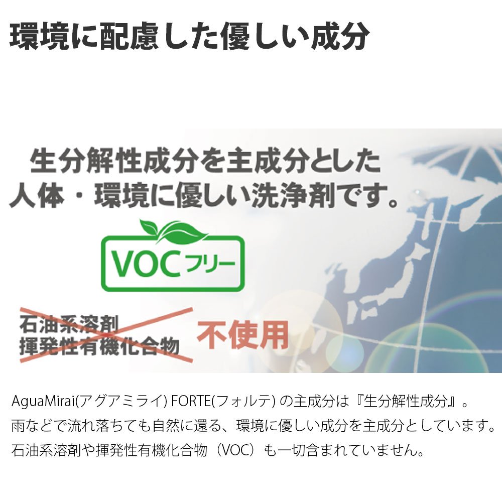 "AguaMirai FORTE" is based on "Eco friendly component (*)" which is harmless to the human body and the earth environment, but it is extremely resistant to stubborn dirt such as oil, insect carcasses, bird's fung etc.