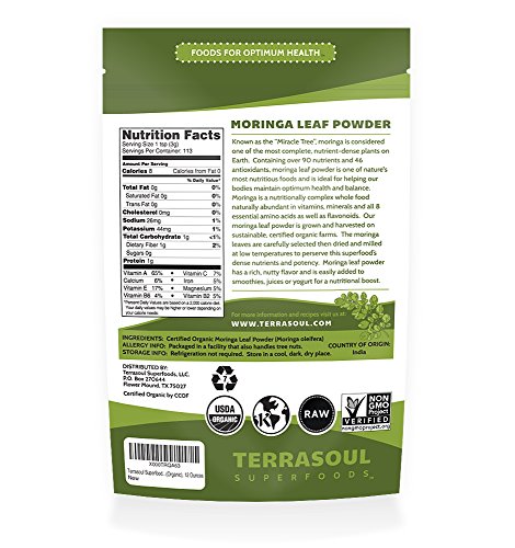 - Feature : Terrasoul Superfoods Organic Moringa Leaf Powder, 12 Ounces / Certified Organic, Non-GMO, Raw, Kosher, Gluten-Free, Vegan / Contains over 20 types of Essential Amino Acids, Vitamins and Trace Minerals. Also rich in potassium, calcium, and iron. / Terrasoul Superfoods sources the freshest and highest quality superfoods from all over the planet. Our mission is to make these amazing, healthy foods available to you at the lowest prices possible while paying our growers and employees fair wages. / 100% Money-Back Satisfaction Guarantee - We stand behind our products and offer a 30-day money back guarantee, backed by an outstanding customer service team.