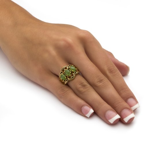 -. Title : Oval Genuine Green Jade Antiqued 14k Yellow Gold-Plated 3-Stone Filigree Ring