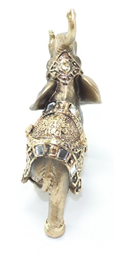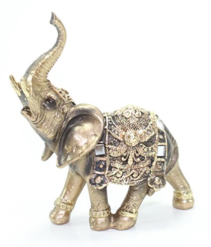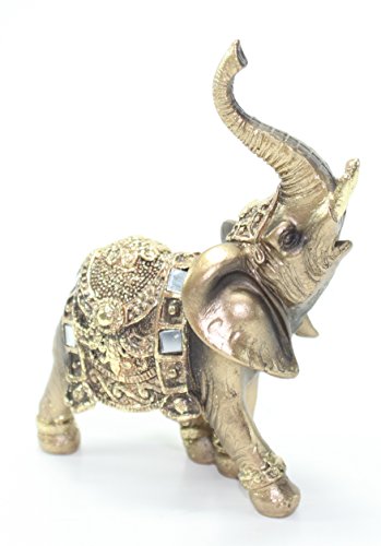 -. Feature : An elegant elephant statue. It symbolizes power, wisdom, strength, fertility, protection of the home!! / Color: Brass Gold. Material: Polyresin. Size: Approximately 4.5"(H) X 4"(L) / Antique style statue with the trunks facing upwards to represent prosperity, good luck, and success!! / The cloak is finely engraved with beautiful flower lightened with striking gold color. Great gift or decorative statue to put in office, front door, living room and beside the bed. / Great collection for ELEPHANT LOVERS!!!